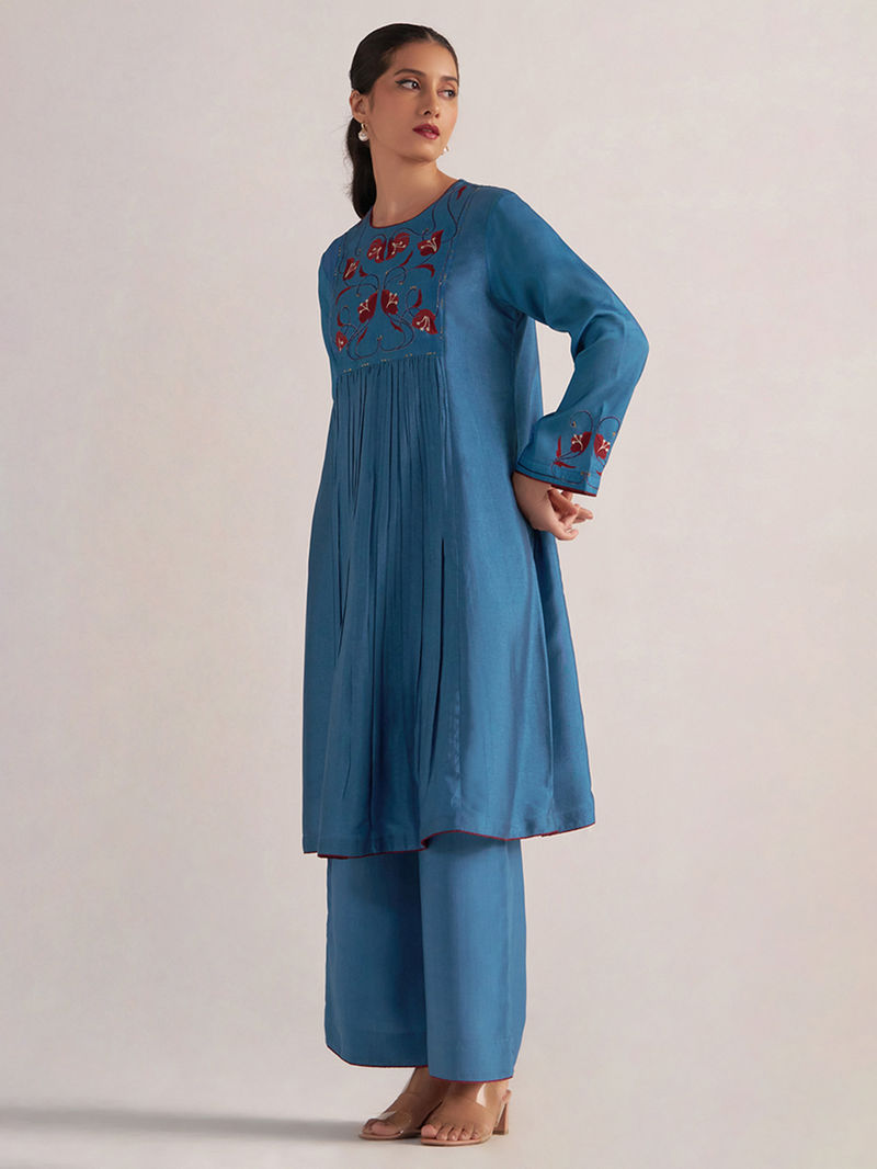 Blue Printed Raw Silk Kurta with Pants - Set of 2