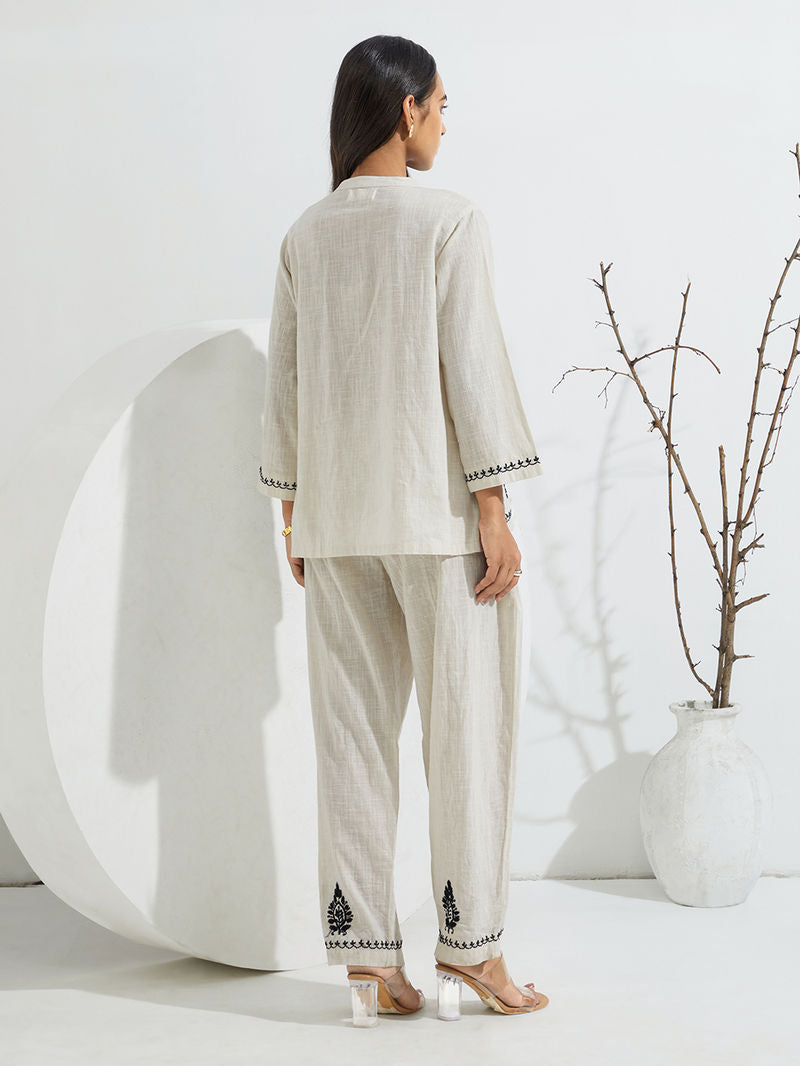 Ivory Chikankari Embroidered Cotton Slub Co-ord Set- Set of 2